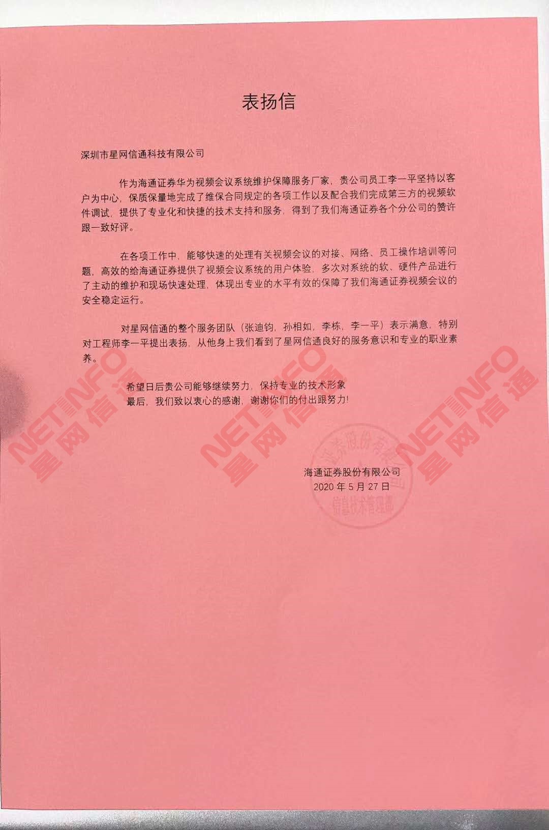我司2020年承接的海通證券股份有限公司--華為視頻會議系統(tǒng)維護(hù)保障服務(wù)項目,在項目維護(hù)過程中,項目組成員體現(xiàn)了極強的專業(yè)素養(yǎng),克服了種種困難,圓滿提前完成了任務(wù),獲得了客戶極高的評價和認(rèn)可??蛻舻臐M意是星網(wǎng)信通存在的最大價值,我們感謝海通證券股份有限公