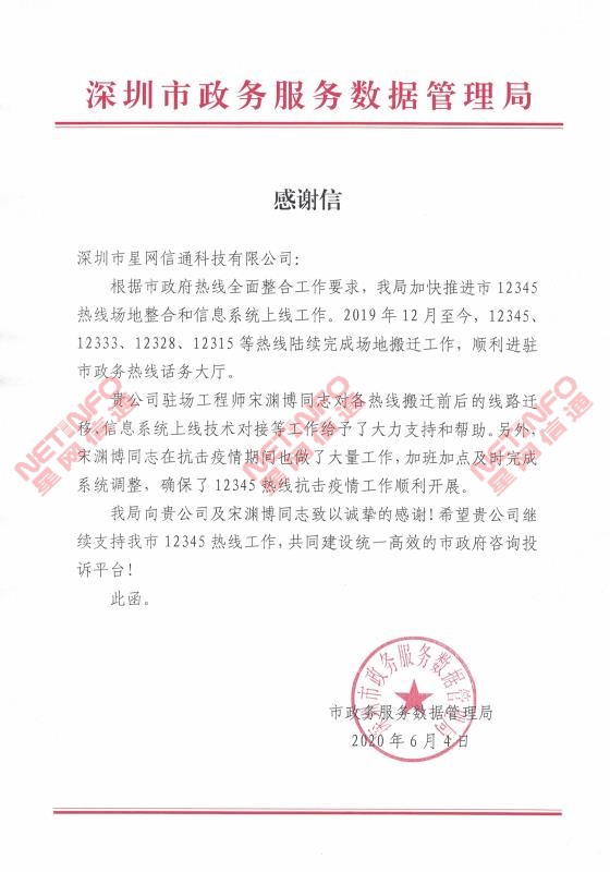 我司2019年承接的深圳市政府--12345熱線項目,在項目過程中,我司駐場工程師體現(xiàn)了極強的專業(yè)素養(yǎng),克服了種種困難,圓滿提前完成了任務(wù),獲得了客戶極高的評價和認(rèn)可。客戶的滿意是星網(wǎng)信通存在的最大價值,我們感謝深圳市政府對我們的認(rèn)可與信任,這無疑是對我們最大