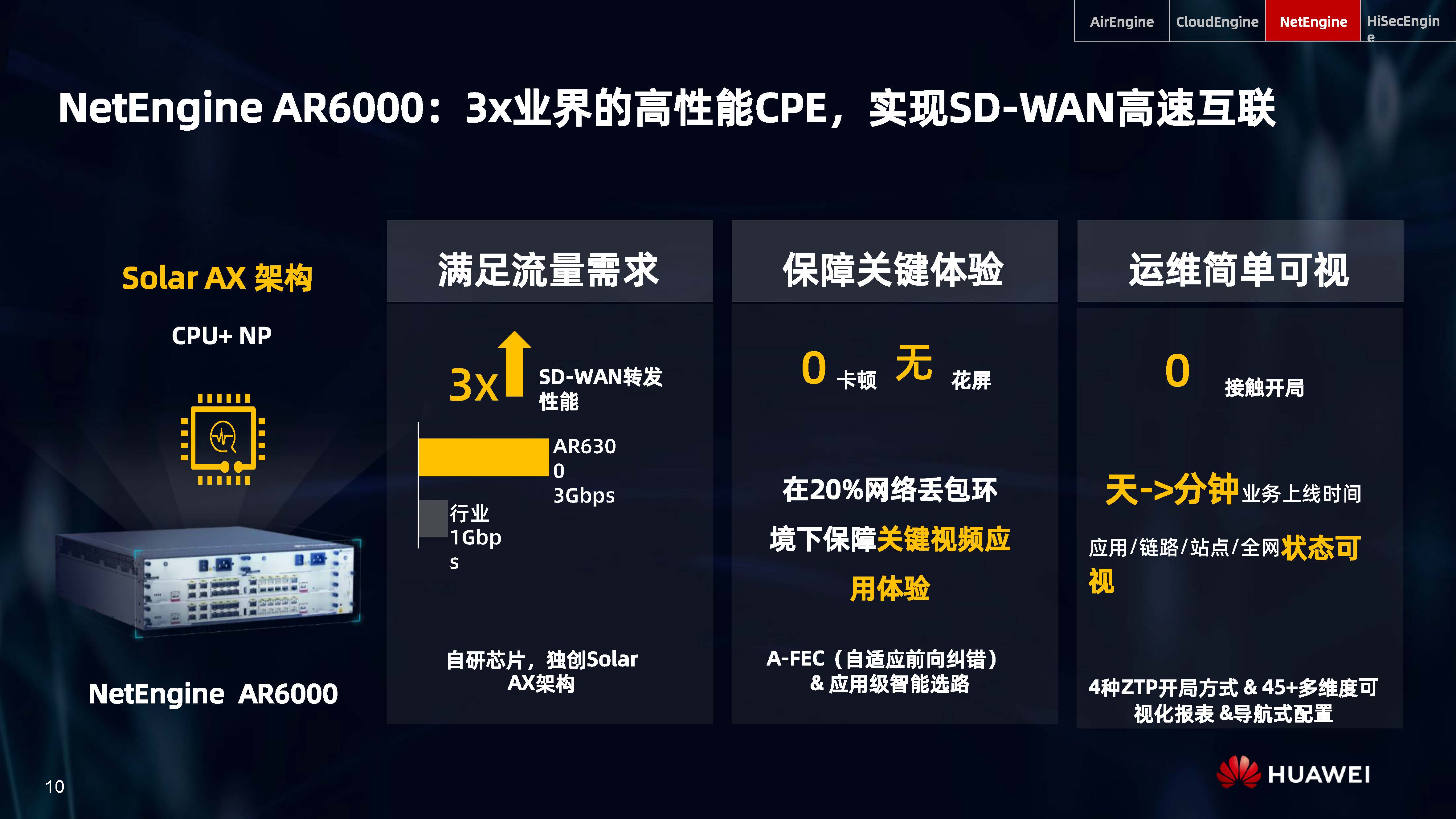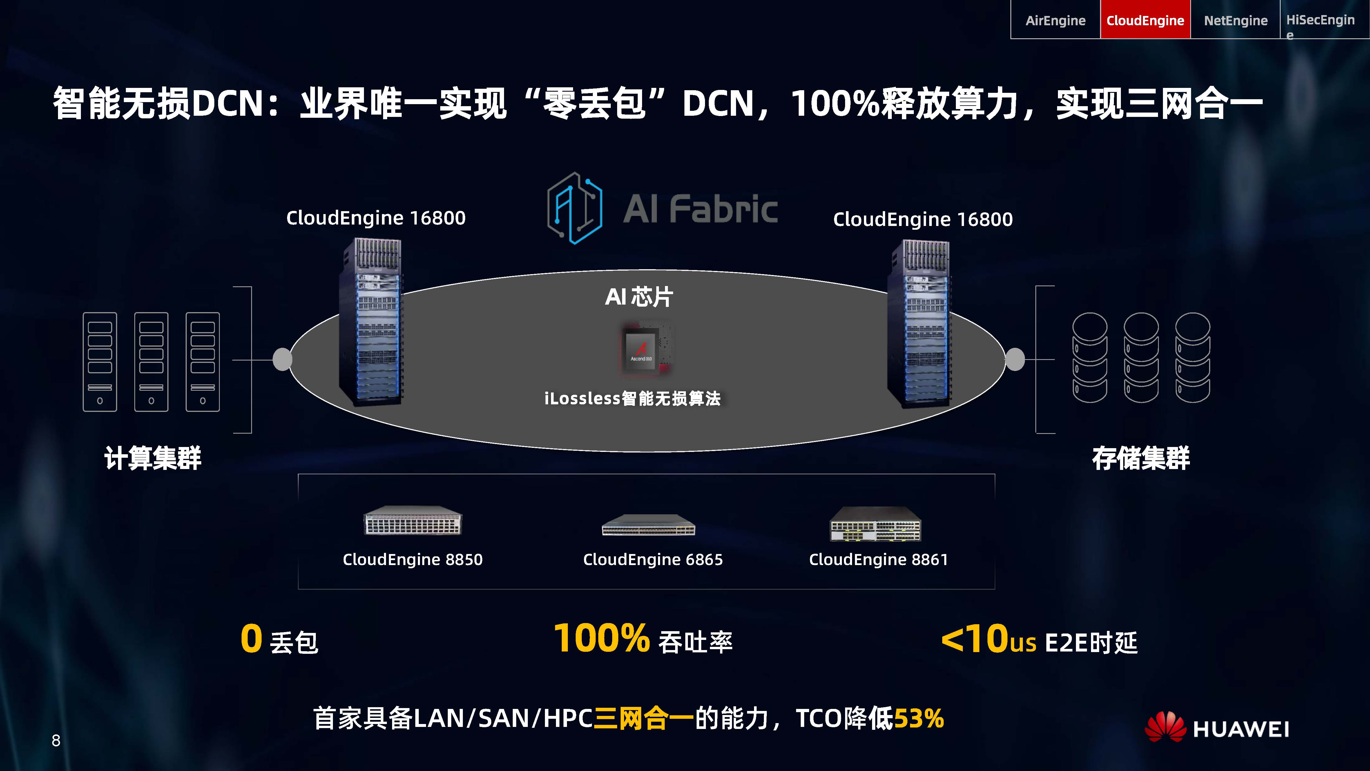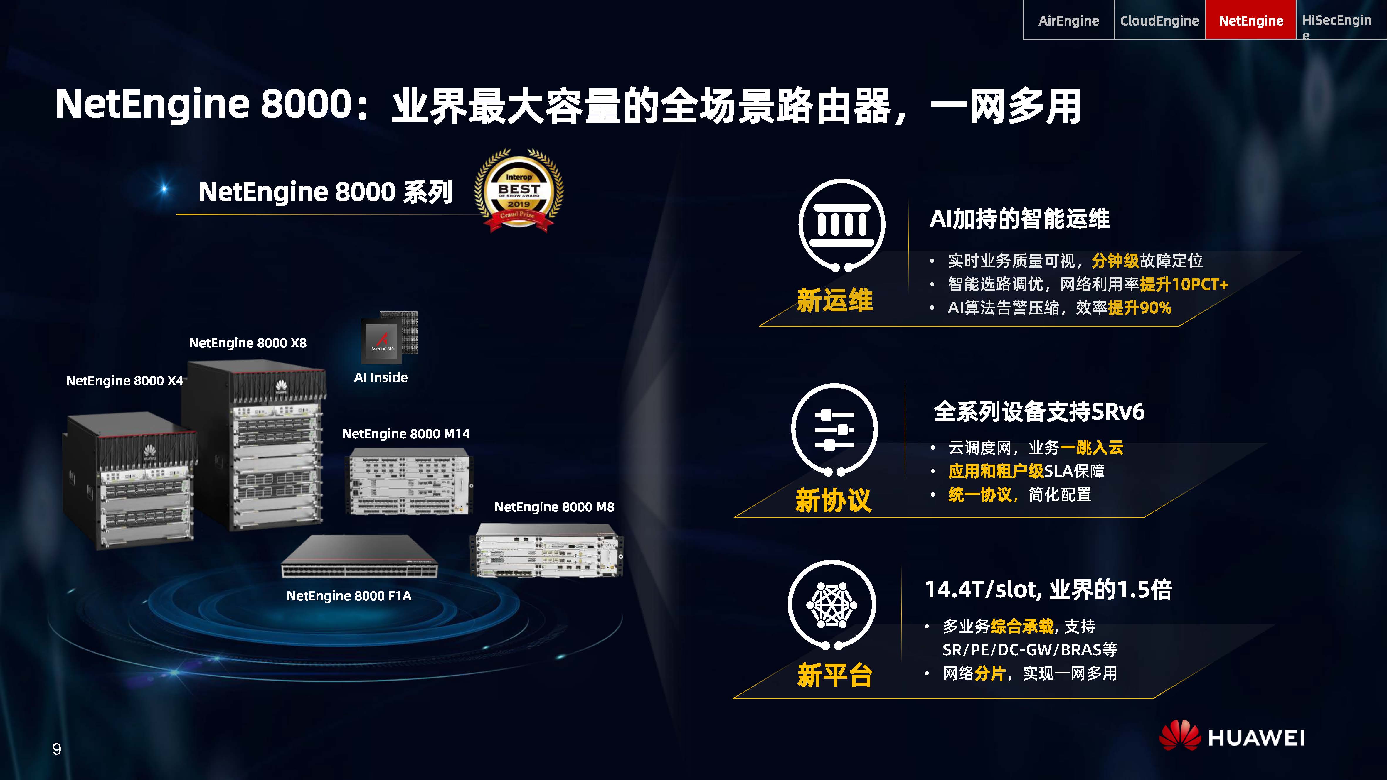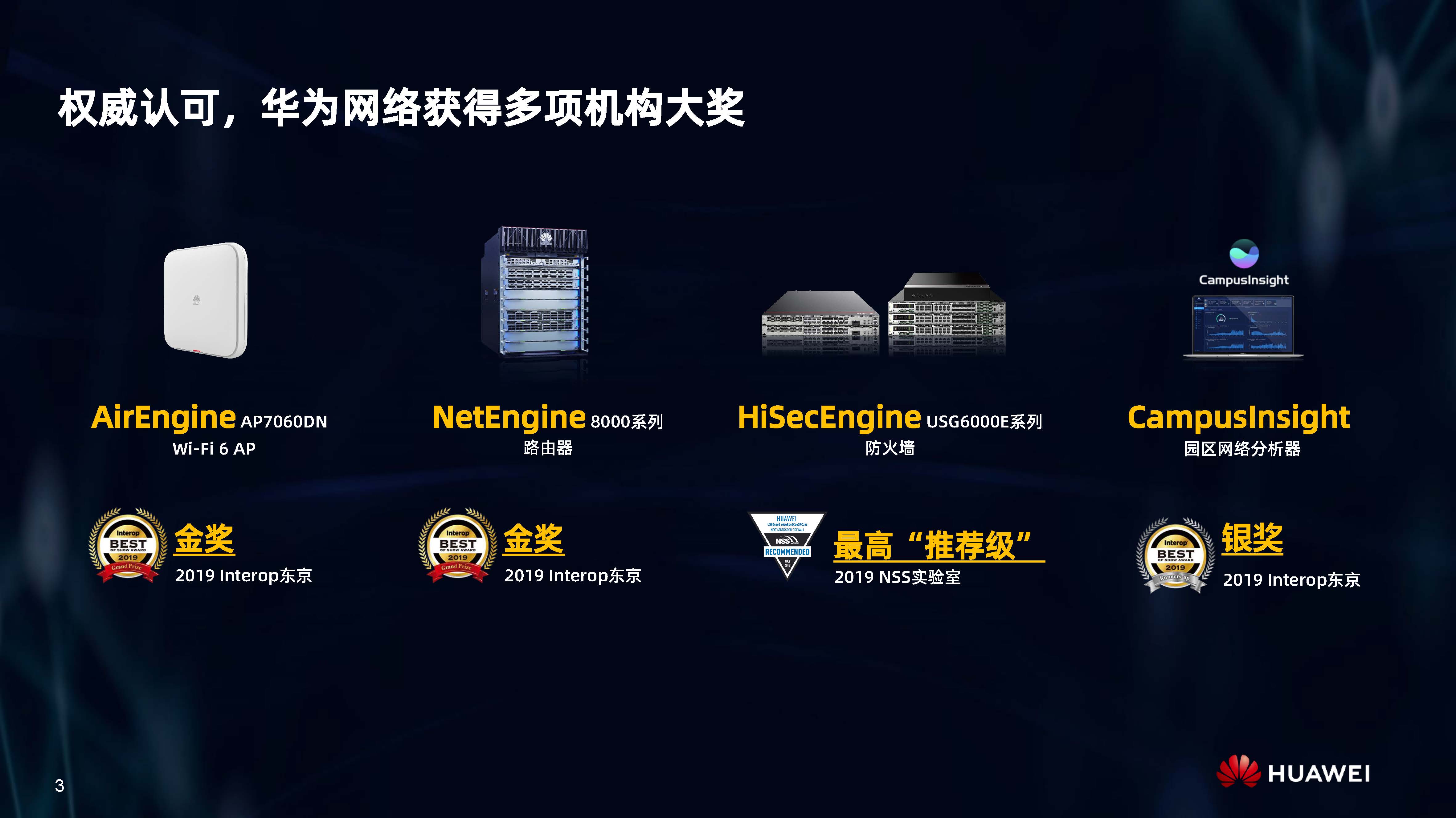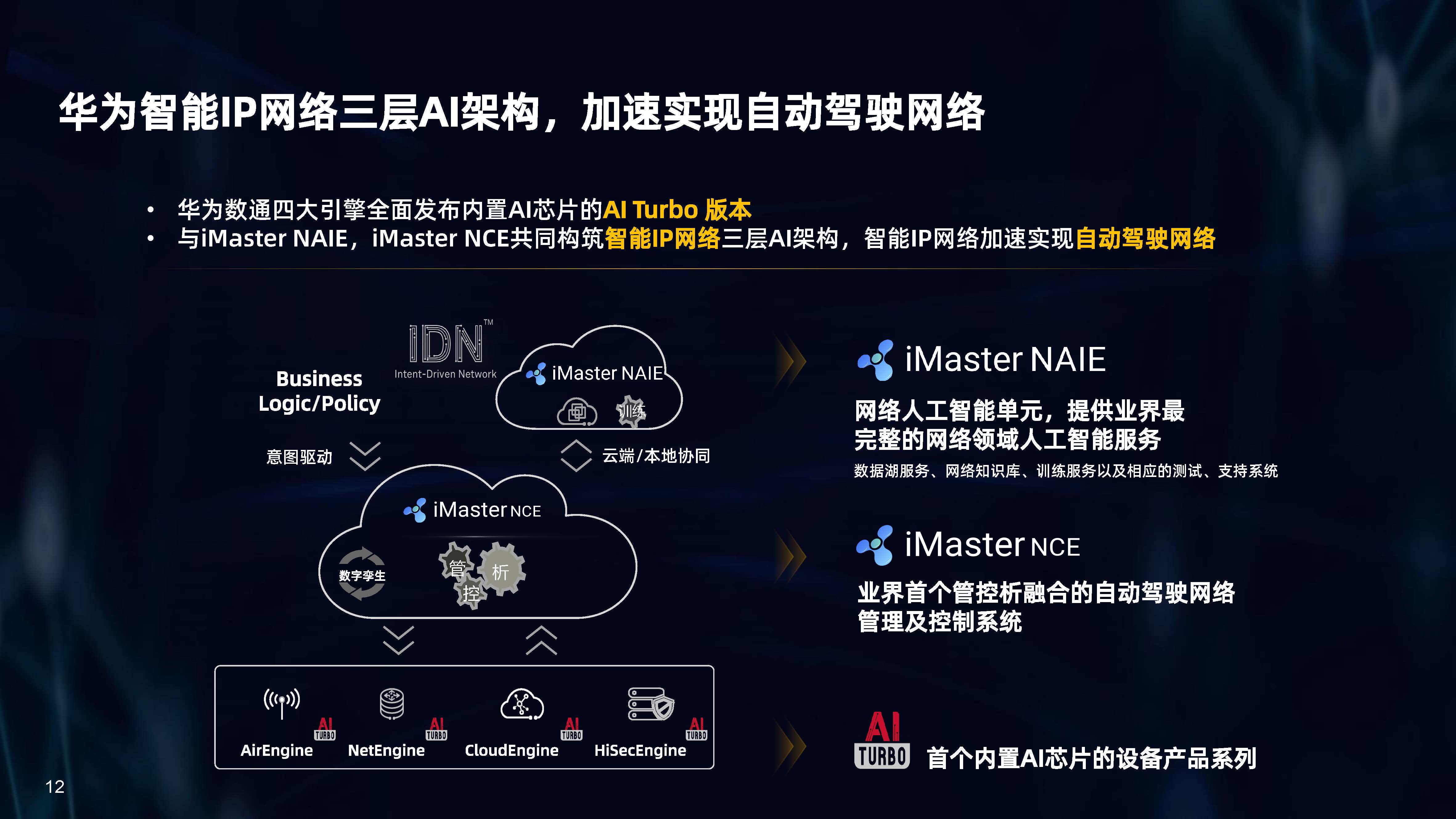 設(shè)備層AI,是內(nèi)置人工智能芯片的AI Turbo設(shè)備系列,涵蓋了AirEngine Wi-Fi 6、CloudEngine交換機(jī)、NetEngine路由器、HiSecEngine安全網(wǎng)關(guān)等四大品類;網(wǎng)絡(luò)層AI,是iMaster NCE自動(dòng)駕駛網(wǎng)絡(luò)管理與控制系統(tǒng);云端AI,是業(yè)界首個(gè)網(wǎng)絡(luò)人工智能平臺(tái)iMaster NAIE。三層AI架構(gòu)全面提升IP網(wǎng)絡(luò)智能化水平,引領(lǐng)智能IP網(wǎng)絡(luò)新時(shí)代。